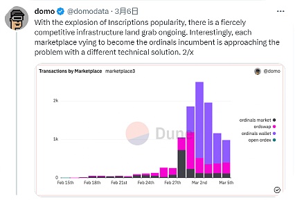 在3月6日,他關注 Blur 與 Opensea 沖突的陰影下,Ordinals對市場的擴張,隨著ordinals流行度的爆炸式增長,激烈的基礎設施爭奪正在進行。其中Ordinals Market 以現有的以太坊基礎設施,使用Emblem Vault開發的技術促進以太坊區塊鏈上的比特幣銘文交易,以規避比特幣網絡速度慢和體驗差的問題,其他方則采用新穎的比特幣原生解決方案。