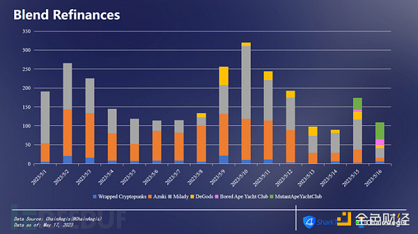 依照NFT序列類別來看,Blend再融資以Milady(圖示灰色)與Azuki(圖示橙色)為主,且二者每日再融資數量相差不大,分別占總量43.91%,41.60%。MutantApeYachtClub上線時間雖短,但也有一定表現。