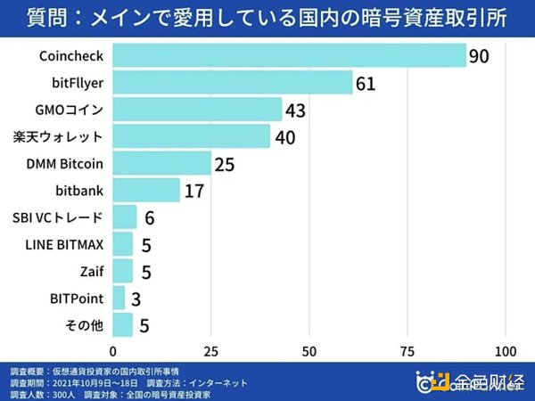 根據針對 300 位日本交易所用戶進行的調查問卷,我們發現在日本最有人氣的交易所包括 Coincheck、bitFlyer、GMO Coin、樂天錢包 (Rakuten Wallet)、DMM Bitcoin 以及 bitbank。