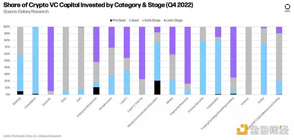 發生在 Web3 領域的投資占據了大多數,而與「交易」相關投資金額占比更高。Web3 領域的融資繼續引領著 VC 投資,占到 2022 年第四季度所有完成交易的 30% 以上,大量早期公司正在 Web3 領域進行構建,特別是在 NFT 子領域。此外,為交易、投資構建平臺與工具的公司繼續在融資金額方面占據主導地位,這表明市場基礎設施在加密生態系統中的重要性和日益成熟。