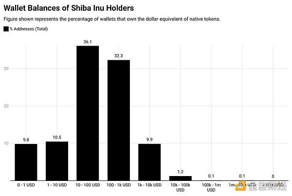 以下是 Shiba Inu 的數據。通過分析擁有 Meme 幣的錢包的分布,我們得出大約 78% 的錢包持有者擁有的金額不到 1000 美元。大多數代幣經濟都遵循類似的發展曲線。它表明散戶資本普遍流向了 Meme 幣,代幣集中在少數錢包中。例如,根據 IntoTheBlock 的數據,有大約 80% 的 Shiba Inu 在 58 個錢包中。