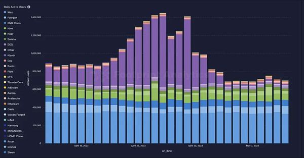 雖然日均活躍用戶數在 4 月 30 日下降至 101 萬,但仍高于月初的水平,表明 4 月 26 日的活躍用戶激增不是一次性事件,而是新用戶在一定程度上得到了高度留存。這次增長對于 GameFi 項目們來說是一個積極的信號。