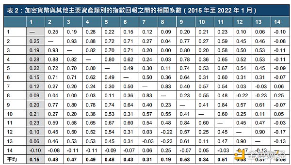 2015 年至 2022 年 1 月期間,虛擬資產與其他主要資產類別的指數回報之間的平均相關系數為 0.15%,