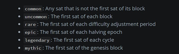 鑒于銘文是使用序數理論刻在單個聰上的,于是每個聰又按編號被劃為了不同的珍惜檔次。BRC-20 的另一個熱點就是尋找那些稀有的聰,對收藏家非常有吸引力,例如那些收集編號小于 100k 的銘文或區塊減半后的第一個銘文等。