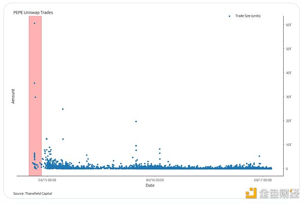 PEPE meme幣在短短4日內飆升了1000倍,讓一些用戶從一無所有到發家致富。我們發現了一些平均成本為0.61 ETH(1210美元)的錢包,這些錢包成功賺取了900多萬美元——回報率為7500倍。然而,買入的時機卻很奇怪: