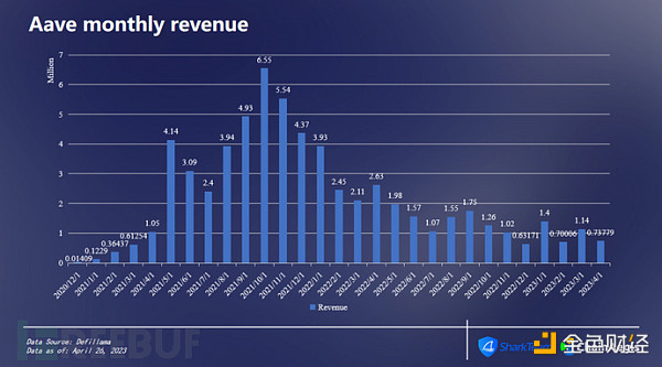 V2版本上線后,協議月收益不斷上漲,曾一度高達655萬美元。但受2022年深熊影響,整體并不景氣,月收益不斷下降,截止到2023年4月1日,月收益為73.77萬美元。