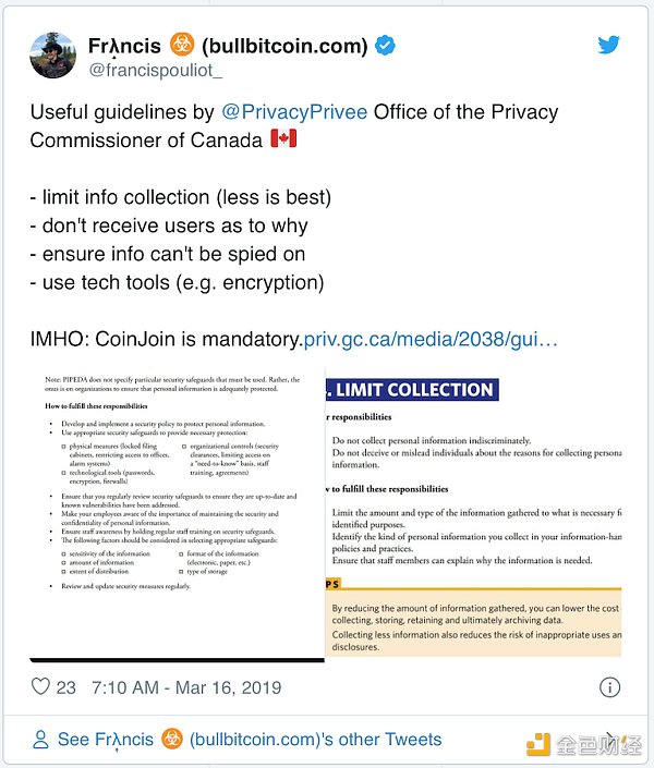 Bull Bitcoin的首席執行官Francis Poulliot與Odell的看法一樣,他也主張比特幣用戶將交易所購買的比特幣使用Coinjoin處理。