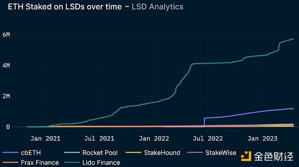 目前也沒有一個數據面板可以跟蹤這個,所以這有點難以分析,但看到質押在 LSD 上的 ETH 在增加,是目前一個主要指標。