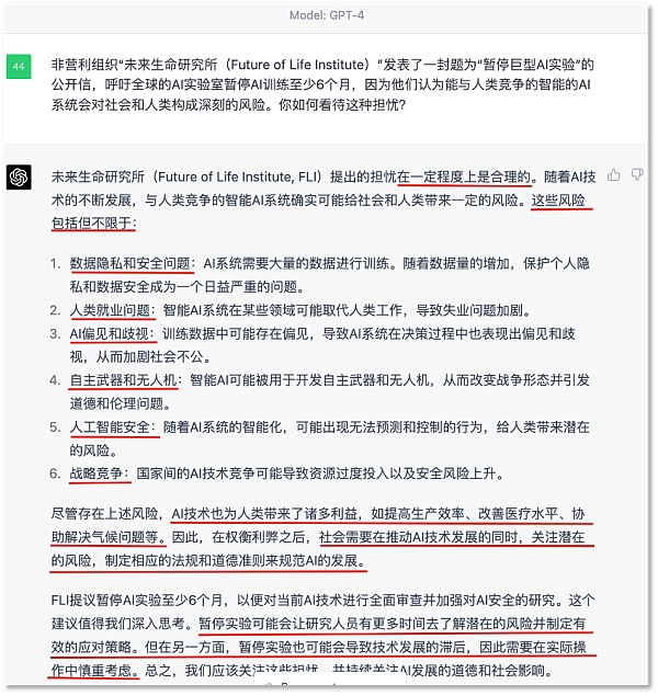 目前,OpenAI 還沒有就 FLI 的這封公開信做出回應。而我們把人類精英們的擔憂與建議甩給了ChatGPT,引發這場紛爭的這個對話機器人不但認可了FLI要求暫停實驗的合理性,還補充了六大AI風險。