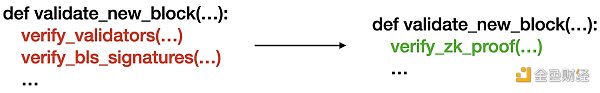 上述驗證方法是原生驗證的通用方案,但是在鏈上直接驗證源鏈共識涉及到大量的鏈上數據驗證與計算,Gas消耗高。而使用ZKP技術,在鏈下完成源鏈數據的計算與驗證,并生成簡潔的源鏈共識傳遞到目標鏈可以大大降低鏈上Gas消耗,這也是為什么基于ZKP的鏈上輕客戶端可以廉價驗證源鏈共識。基于ZKP的跨鏈協議將聚合公鑰驗證BLS簽名的過程放在鏈下,并生成ZKP證明,目標鏈客戶端只需要驗證一個零知識證明就可以驗證源鏈共識。具體代碼如圖1 所示。