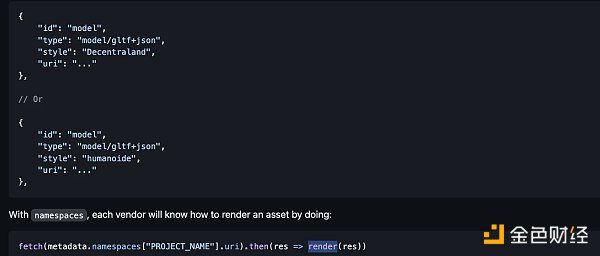 有了新字段命名空間(namespaces),每個項目方或者供應商都可以通過namespaces來直接調用NFT資產(如上圖代碼所示),這將允許開發人員在單個智能合約或應用程序中使用多個NFT元數據時避免命名沖突。并且NFT的元數據將允許錢包、市場、元宇宙等NFT相關應用程序與任何NFT互相操作。這項提案對需要支持多種元數據模式的NFT市場很有用,即使多個賣家使用不同的元數據模式,該EIP將使得市場運營商能夠確保元數據密鑰是唯一的同時自由儲存特定的JSON數據。該建議的解決方案甚至可以有更廣泛的應用,如大型Gamefi和元宇宙中的大量NFT可以通過自定義元數據來呈現不同屬性,同時可以避免命名沖突,極大的提高了NFT的互操作性。
