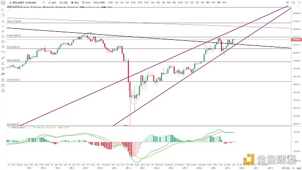前面回踩并未有效跌破14000-10500的下降趨勢線支撐,昨日迎來反彈,再次逼近10000關口,10000不是關鍵壓力位,近期主要壓力還是14000下來的0.618點位10100附近,這個位置有效突破,下一步才會繼續上攻前頂10500美金,日線MACD指標線粘合,近期成交量一般,目前發動大幅上攻的可能性不大,短期還是個震蕩整理的走勢,5日、10日均線死叉之后又金叉,其余日均線順向多頭排列,趨勢上整體還是向上的,技術圖形上,也能看目前仍處于上升楔形三角區間內運行,不破趨勢支撐可逢低布局。