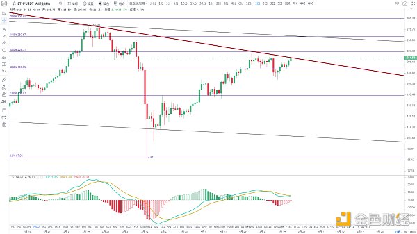 近期ETH整體走勢明顯強勢,目前漲幅已吞沒5月10日的大跌陰線,幣價突破20日均線,5日線上穿10日和20日構成金叉看漲姿態,日線MACD指標線也即將金叉向上,短線走強趨勢明顯,近期持續拉升,圖形上已漲至日線下降壓制線附近,這個位置有一定的空頭阻力,突破繼續上攻前高227美金,也是0.5斐波那鍥點位的概率將有機會,預計短期遇阻回撤蓄勢后,下一步上行突破的概率大,操作上逢低吸納為主,不破5日線持有為主。