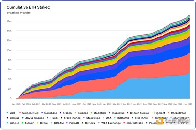 圖3:質押提供商的累計ETH質押。來源:ConsenSys、Dune Analytics、@ Hildobby