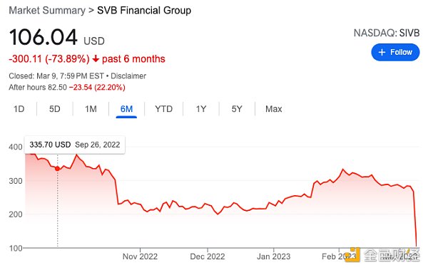 受此消息影響,硅谷銀行(Silicon Valley Bank)股價開盤暴跌40%,收盤跌幅達到近74%。