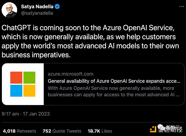 今年1月中旬,納德拉就曾預告,微軟即將在Azure中整合進ChatGPT。