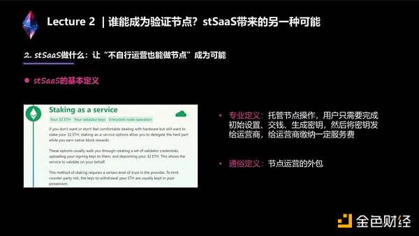 提幣密鑰和質押密鑰相分離,給這些 stSaaS 的服務商一個可能性——作為一個 solo staker,只需要把這個質押密鑰交給這些質押服務商,服務商會去啟動節點去運維。相比于 solo staker 來說,找 stSaaS 服務商是一個次安全的方案。因為質押密鑰是給服務商的,但是這樣就把運營的義務和懲罰的風險給轉移到了驗證者的身上,如果說你選擇了一家不那么好的質押服務商,就可能會有損失。比如服務器的離線造成的驗證者的損失,或者他運營得不好,甚至出現雙重投票的問題,就會承受一個 slash 的風險。所以 stSaaS 相對 solo staking 而言是有一定的風險,因此選擇一家安全可靠的質押服務商是一個非常重要的問題。