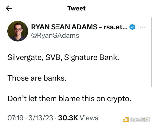 “Silvergate、 SVB、Signature,這些都是銀行。不要讓那些人甩鍋 crypto。”