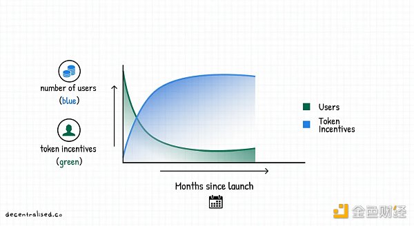 無論如何,在過去,用戶放棄發行代幣地項目的歷史趨勢是存在的,這個陷阱來自于這樣一個事實,即創始人(可能)認為通過代幣激勵獲得的用戶具有粘性。在理想條件下,代幣獎勵與產品用戶之間的圖表應該如下圖所示: