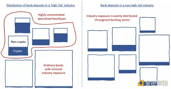 首先,Silvergate在根本上處于脆弱的地位,因為監管機構勸導銀行不要與加密貨幣打交道。因此,加密公司在銀行業務方面幾乎沒有其他選擇,Silvergate作為主要的加密友好銀行,加密公司的存款比重大。這種結構性漏洞是監管機構對此類銀行進行擾亂的直接原因。通常,一個行業會有各種各樣的銀行提供服務,從而降低任何一家銀行在該行業的風險敞口。但由于人們普遍不鼓勵銀行接觸加密貨幣,存款涌向了少數愿意承擔風險的銀行。