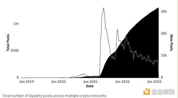 為了見證所有這些都可應用于現實而非停留于理論,我們來看一些數據點并推斷潛在的趨勢。首先,我們來研究現有流動性池的數量。一個流動性池,雖然只是Uniswap(一個流行的DEX,即去中心化交易所)等更大協議的一部分,但在技術上可以被視為一個獨立的市場。再加上這些池的代碼很容易分叉,計算現有市場的數量可以讓我們對為什么會出現上百萬個市場有一個方向性的認識。
