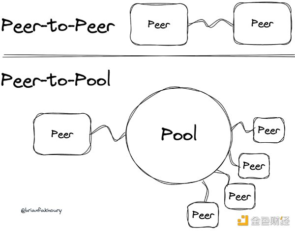 在點對池模型中,用戶自己與資本池交互,利用管理資本池的規則來執行他們想要的操作。例如,將以太幣(ETH)交易兌換為USDC這樣的穩定幣與傳統資本市場操作不同,在傳統的資本市場中,雙方必須達成一致才能執行交易。而在點對池模型中,有ETH和USDC池讓交易員可以存入ETH并提取USDC,這些池的存在是因為有其他用戶被激勵賺取費用。交易價格由一段代碼控制,也就是以太坊區塊鏈上的一個公正的智能合約,并且是完全無需許可的。