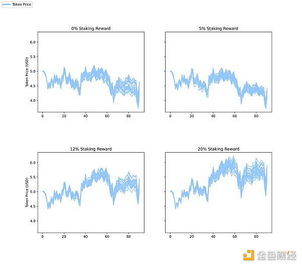 Staking(質押)允許代理人鎖定代幣一段時間以獲得額外獎勵。在我們的模型中,代理人可以選擇在每個時間段內進行 6 個月的鎖定期質押。他們根據預期回報和鎖定代幣的機會成本,以及市場趨勢和他們自己過去的行為等一系列其他因素做出決定。為了研究不同質押激勵的影響,我們在 0%、5%、12% 和 20% 之間改變質押回報率。