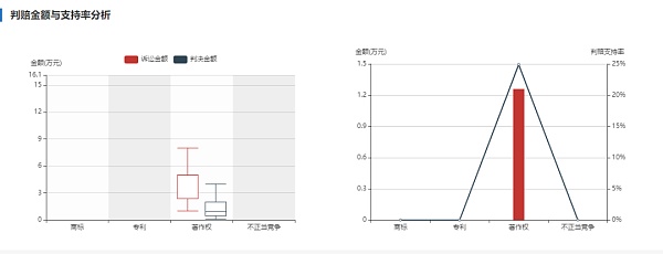 來源:知產寶裁判文書可視化分析 以視覺中國旗下公司——漢華易美(天津)圖像技術有限公司為例。該公司作為當事人,可以檢索到的著作權糾紛案件達1317件,案件集中分布在2016年~2021年間,單案平均判賠金額1.26萬元,判賠支持率24.92%。那么,這些案件中,漢華易美天津公司通過維權取得的賠償金可達到413萬元。