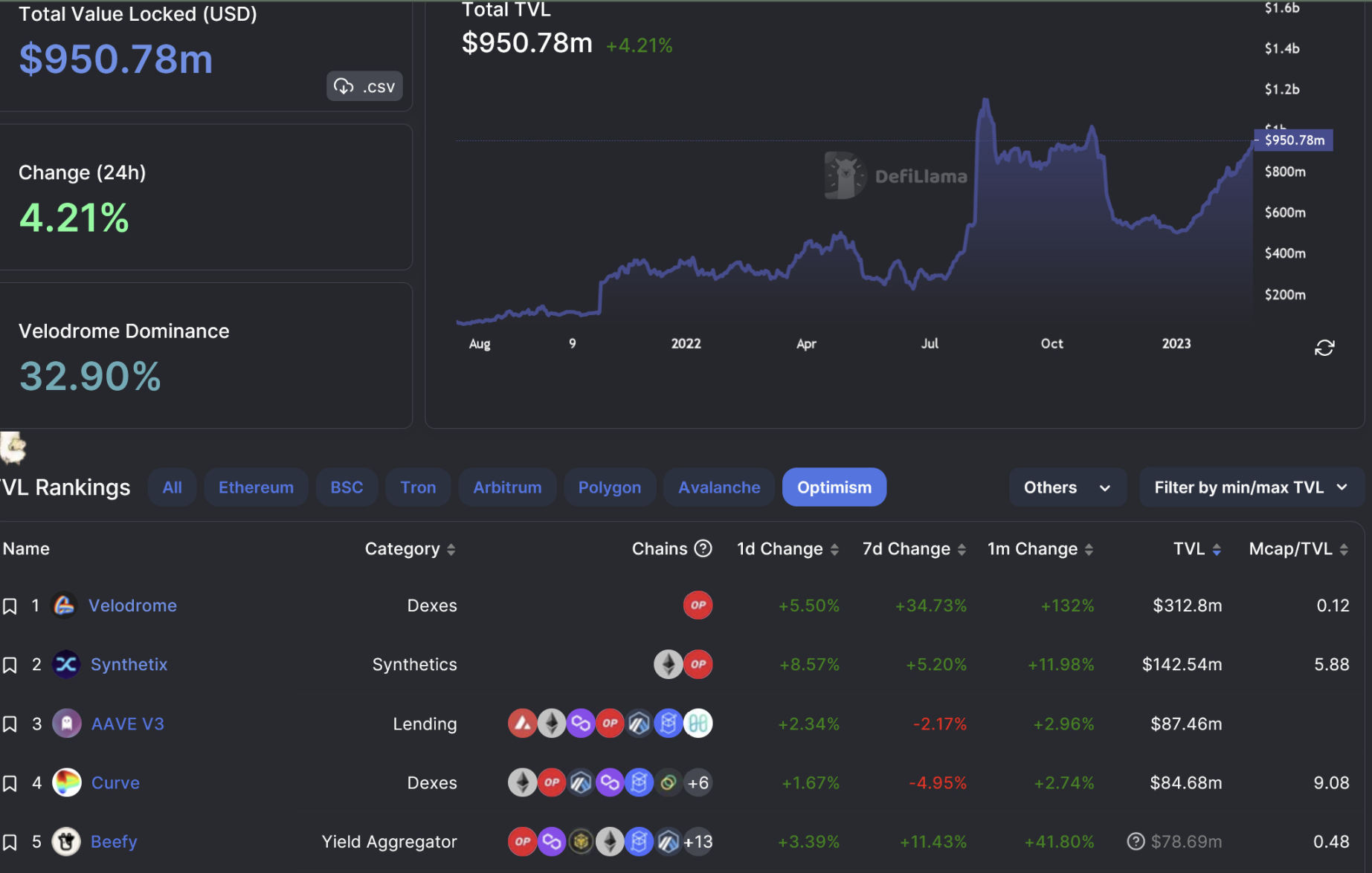 DefiLlamaOptimism 的排名落后 Arbitrum 三位,但其 TVL 成功地增加了 35%,達到了 9.5 億美元。