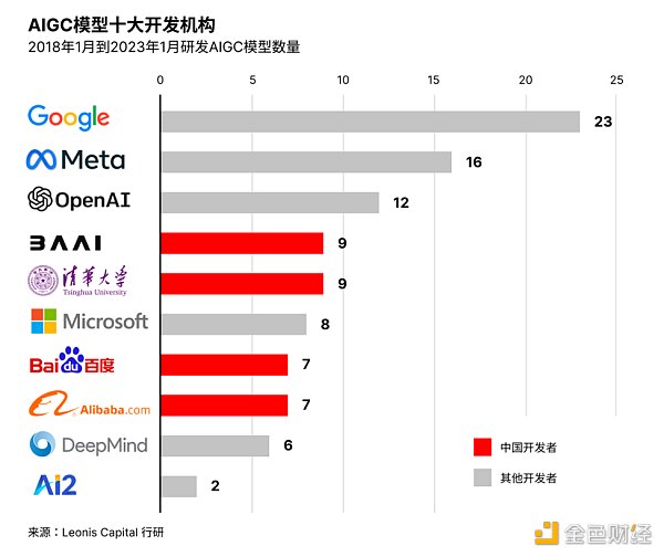 從AIGC模型數量上來看,全世界前十的AIGC模型研發者中,中國機構占了四個。其中有學院派的BAAI智源研究院和清華大學,也有產業界的百度和阿里巴巴研究院。頂級的西方AI機構谷歌、Meta還有OpenAI當然也榜上有名。值得一提的是,除了英美之外,雖然以色列有AI21,加拿大有Cohere,只有中國有多家機構在研發AI模型。