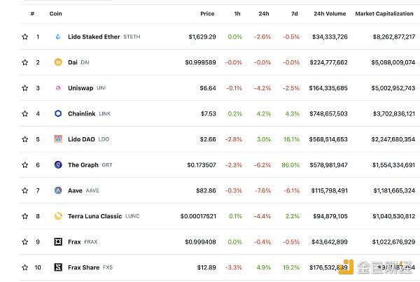 DeFi項目鎖定資產前十排名及鎖倉量 數據來源:defillama