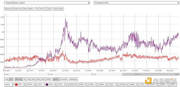 隨著以太坊有效地址數量不斷增加,日均交易量也在增加。根據 Coin Metrics 分析數據,以太坊網絡日均交易量已接近 100 萬筆,創下近一年最高水平。作為參考,目前比特幣每天處理的交易量約為 30 萬筆。