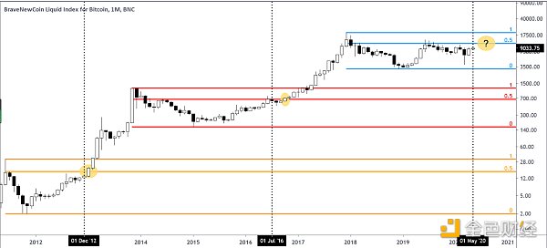 BTC目前已完成了第三次產量減半,上圖為BTC2010-2020長期月線走勢,通過研究可以發現,每次減半前BTC價格均位于上一輪牛市頂點回落的斐波那契0.5壓制線下方運行,2012年的第一次和2016年的第二次以及2020年的第三次均是這種走勢,即便19年的小牛行情和今年初的行情,兩者沖頂月線收盤均未能突破,目前價格也是處于17年牛市頂點下來的0.5點位下方,目前該點位處于11400美金附近,意味著該區域的趨勢壓制作用還是較強的。同時,前兩次減半后的3個月內,BTC價格在減半落地后短期內快速回落,后面經過一段時間的調整蓄勢,都會反轉繼續向上攀升,并突破上一輪牛市頂點回落的0.5壓制位,并且一旦月線突破站穩,后面就會出現月線連陽,大牛市行情也由此啟動,這在2013年與2017年的牛市行情均得到驗證,同時這個壓力帶也是17年牛市頂點與19年小牛頂點連線的長期下降壓制線區域,一旦突破意味著17年大牛拐頭回落的長期壓制局面得到逆轉,后面啟動長周期震蕩向上的牛市行情概率將大大增強,所以減半后的這幾個月比較關鍵,或將是長周期牛市啟動前的最后低吸機會,中長線操作建議逢大幅回落分批布局為主。