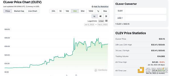 Clever的整體的設計其實挺巧妙的,但是這種杠桿模型在正螺旋的時候才凸顯價值,產品其實已經上線半年多了,之前市場一直跌,這項目毫無活力,近來市場轉暖,這個產品才活躍起。因為當CVX在上漲時,持幣用戶很樂意來抵押CVX,對CVX有極大信心的還可以復投不斷加杠桿,只要CVX一直漲,這個收益會很舒服。一月份的反彈,CVX漲了一倍,這個產品的代幣CLEV也漲了不少。
