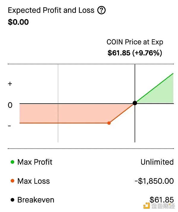 在 COIN 交易價格超過 61.85 美元(60 美元行使價 + 1.85 美元溢價)之前,你的朋友不算獲利,但在最初的 1850 美元投資之外沒有任何風險敞口,COIN 超過 61.85 美元的每一分錢都是真正的利潤。