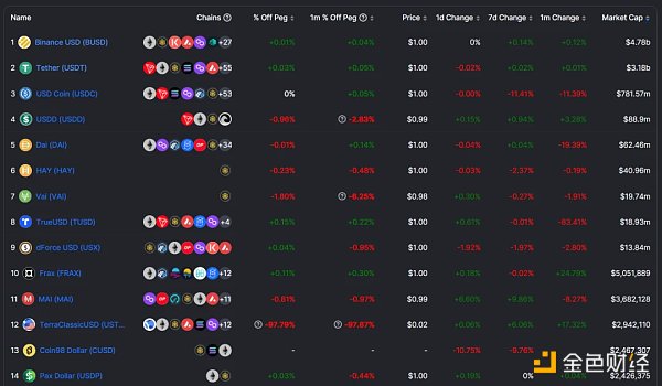 緊接著是 USDT 市值約為 32 億美元(35% )、USDC 市值約為 7.8 億美元(8.67% ),以及一些市值低于 1 億美元的穩定幣如 USDD\Dai\HAY 等。