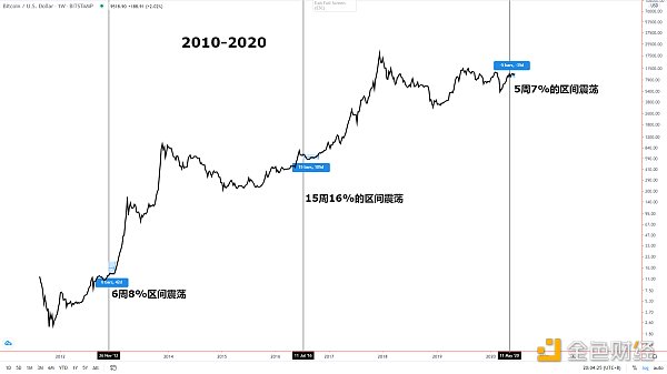 上圖為BTC三次產量減半對應的時間點,圖中標注的是每次減半完成后所經歷的區間震蕩時間周期以及相應的區間振幅,這一過程完成后,前兩次BTC突破這一震蕩區間開啟了新的上漲波段,后面迎來了大牛行情。