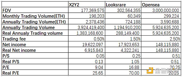 通過上面的數值測算,如果不考慮交易挖礦這種虛增交易量的因素,不難看出Opensea的估值最高,X2Y2的估值最低。當我們把交易挖礦考慮進去,可以發現Opensea的真實PE為20、X2Y2的真實PE為25.65,而Looksrare的真實PE高達70。