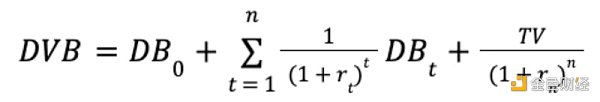 其中 FTFt 代表第 t 年的自由代幣流量,rt 代表第 t 年的折現系數,TV 代表最終價值。