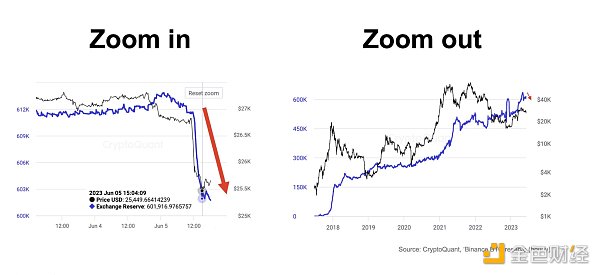 根據Glassnode的數據,在美國證券交易委員會(SEC)于6月5日發布訴訟后,約有10,000個比特幣從幣安交易所中提取出來。這相當于幣安的比特幣余額下降了約1.5%。在2023年3月中旬,加密貨幣市場暴跌時,出現了更大的跌幅。