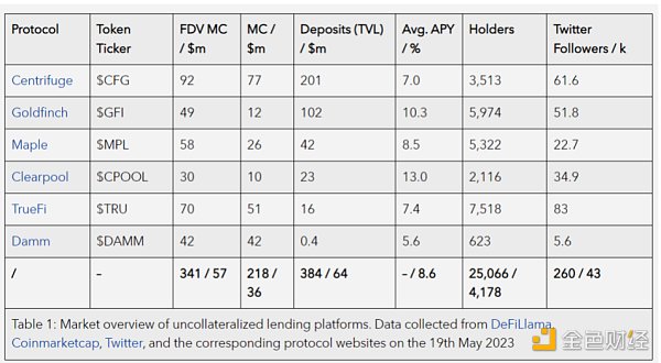 表1顯示了向機構借款人提供無抵押借貸的一些協議概況,協議按總鎖定價值(TVL)進行排序。
