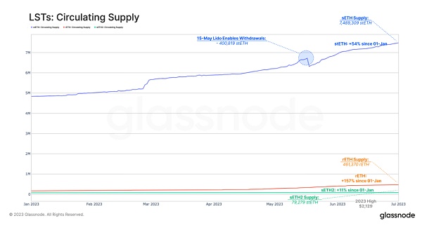 以太坊上海升級在4月中旬完成,參與者能夠對質押的ETH進行提款。與其說是催生了一波提款潮,不如說是進一步加速了質押存款活動的進行,市場對流動性質押衍生品LSD表現出了明顯的偏好。