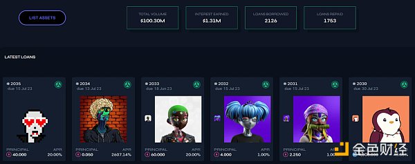 NFTfi.com,是一個成熟的拍賣場形式 P 2 P NFT 借貸平臺,其出價、利率計算與時間都由資金提供方與 NFT 抵押方共同決定,是點對點借貸業務中的頭部平臺。