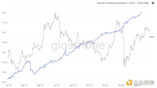 從上圖看,持幣32個ETH以上的地址數量一直在顯著增加,32個ETH是以太坊2.0鏈中驗證者的質押代幣數量,我們看到地址增長,很大程度上顯示了Eth2.0驗證者的進程是積極的,且并未因價格變化受到很大影響。