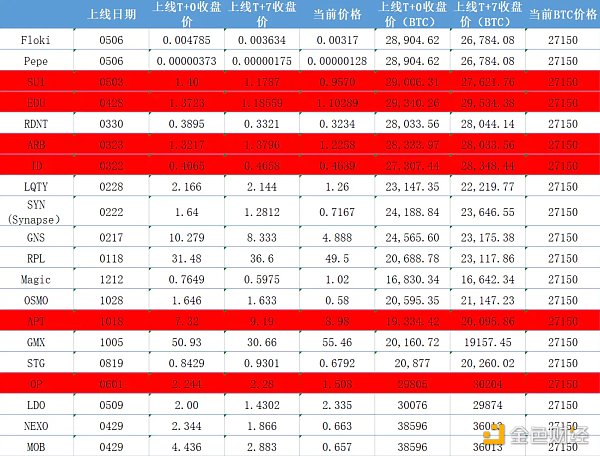 可以看出,Binance 的[上幣效應]非常明顯,除 LDO 外,Binance 的剩下 13 個新幣均出現了明顯漲幅,平均上漲 35.8%。(LDO 上線期間 BTC 價格出現了 39K-29K 的下跌),35.8% 即使扣除-22.3% 的上線至今收益率,仍可以取得 13.5% 的收益率。