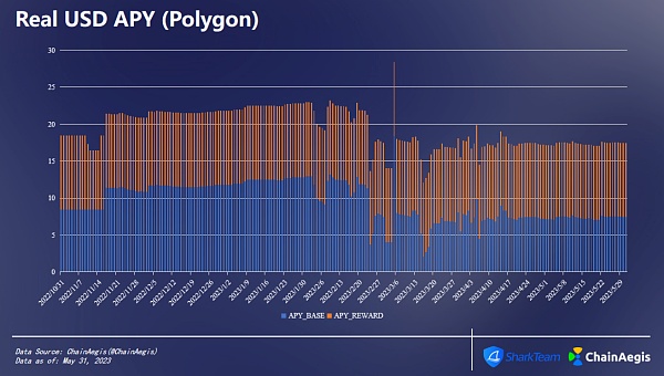 下圖為USDR在Polygon鏈上的APY變化情況。年利率(Annual Percentage Yield,APY)指的是一年復利(利息+本金)所賺取的金額。可以看到,當前APY較上線初期總體變化不大,略有下降趨勢,下降了5.78%。