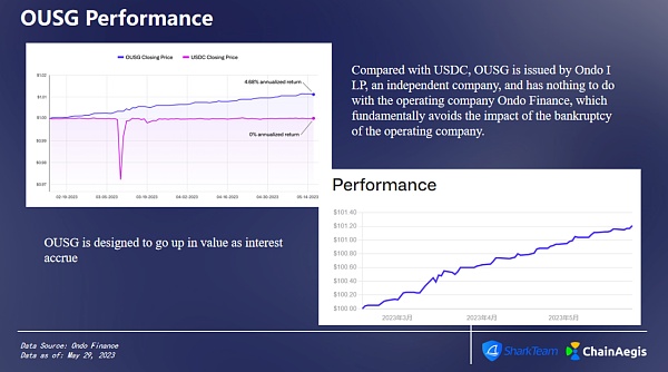 作為國債基金的OUSG旨在隨著利息的增加而升值,截止到5月29日,其代幣價格為$96.83。