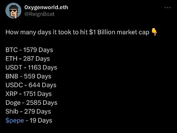 今年四月份橫空出世的 $PEPE 以迅雷不及掩耳之姿,短短僅花了 19 天時間,便完成數十萬倍的漲幅并上線幣安,成為史上最快速到達市值 10 億美金的代幣,$PEPE 的出現也引爆了加密世界另一波 Memecoin Season 鏈上各種土狗代幣瘋漲、Gas Fee 飆升,每天都有漲了數十倍的新幣出現,此風潮一直持續了將近兩個月,直至六月底才趨近冷靜。