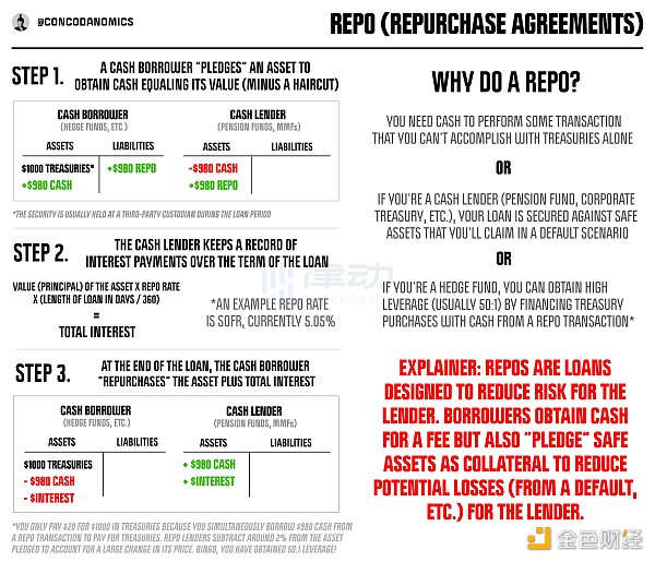 當 Conk 的回購市場康加舞(Repo Conga)揭示出來時,一切變得清晰起來。回購市場是一個由市場參與者組成的鏈條,他們希望通過在融資成本之上收取利差來獲利。現金貸款方通過經銷商向「復雜」的借款方提供貸款,經銷商收取利差進行中介。