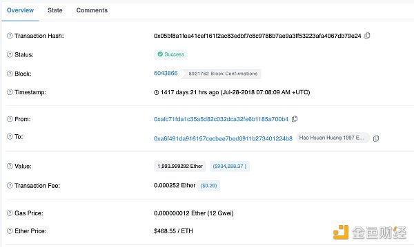 1a. 7 月 28 日凌晨 3:25(UTC)向 Bun Hsu 的幣安賬號存入了 2000 ETH